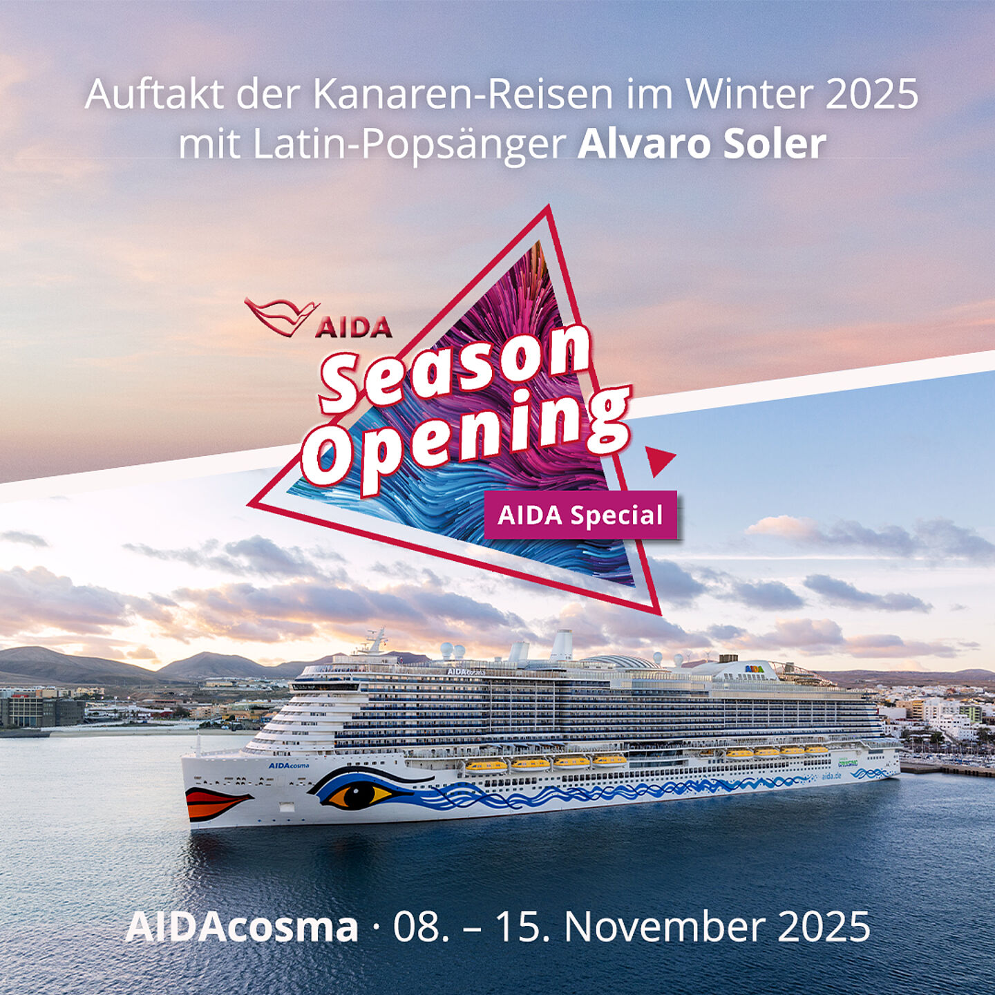 Das Triple macht AIDAcosma am 8. November voll: Zum Auftakt der AIDA Kanaren-Reisen können Gäste live an Bord von AIDAcosma ebenfalls einen musikalischen Stargast erleben. Latin-Popsänger Alvaro Soler wird gleich zweimal im Theatrium auftreten und mit seinen gefühlvollen Songs begeistern. Mittlerweile ist Alvaro Soler nicht nur auf der Bühne, sondern auch als Jurymitglied in TV-Shows heiß begehrt. Mit über 150 Gold- und Platinauszeichnungen zählt der in Barcelona geborene Musiker zu den erfolgreichsten Latin-Pop-Stars in Europa. Spanisches Flair vermitteln neben dem Stargast auch die „Inseln des ewigen Frühlings“. Die Kanaren sind ein Magnet für alle, die dem heimischen Winter für ein paar sonnig-milde Tage entfliehen möchten. Das angenehme Klima der Kanaren schafft ideale Voraussetzungen für eine Auszeit vom Alltag.